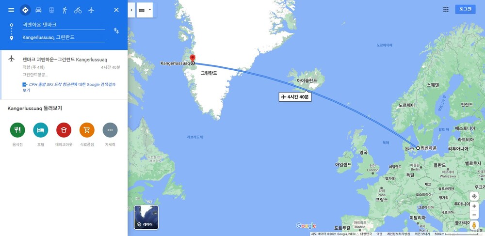 2 Day 호텔 조식 후 그린란드항공편으로 코펜하겐 출발 / 캉에를루수아크 향발 (비행시간: 약 4시간40분 소요예정)